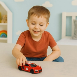 Acest automobil sport roșu din metal și plastic de calitate oferă un raport excelent între dimensiune și distracție. Datorită mecanismului pull back, este suficient să tragi mașinuța înapoi și să o lași – pornește imediat înainte. Ușile care se deschid și finisajul detaliat al caroseriei susțin joaca creativă și scenariile realiste.