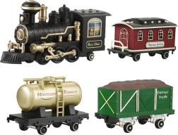 Acest circuit tren electric cu design clasic de locomotivă cu abur încântă atât copiii, cât și pasionații de cale ferată. Locomotiva, după adăugarea apei, creează fum realist, completat de lumini și sunete, ceea ce face deplasarea să pară ca pe șinele reale. Controlul RC 2.4 GHz asigură semnal stabil și manevrare cursivă, cu alegerea direcției și reglarea vitezei.