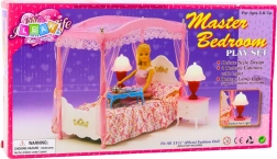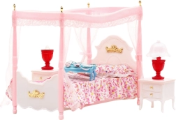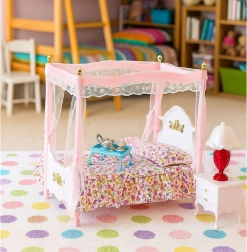 Elegantul set de dormitor pentru păpuși de aproximativ 29 cm cucerește prin patul cu baldachin, draperiile fine și execuția atentă a detaliilor. Setul include două noptiere, lămpițele și un complet de lenjerie de pat. Combinația pastel roz-alb și materialul de calitate asigură rezistență și distracție de durată, stimulând creativitatea și imaginația.