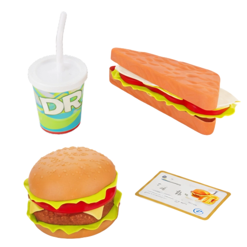 Un burger, o baghetă și o băutură completează scenariul de restaurant. Copiii pot comanda, servi și plăti – o experiență completă de fast food.