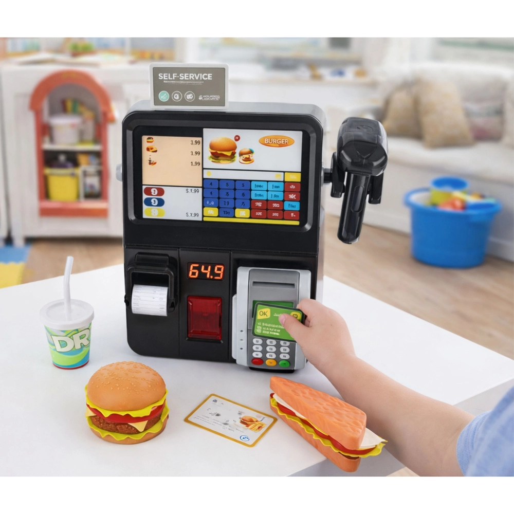 Această casă de marcat self-service pentru copii este ideală pentru micii vânzători și bucătari. Funcțiile realiste – de la scanare la tipărirea bonurilor și plata cu cardul – creează o atmosferă autentică de magazin sau fast food. Datorită efectelor luminoase și sonore, jocul este dinamic și captivant.