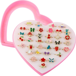 Acest set colorat de inele va încânta toate micile cochete. Datorită diametrului ajustabil, inelele se adaptează ușor degetelor copiilor și oferă o purtare confortabilă și sigură. Capacul transparent al cutiei în formă de inimă permite depozitarea ordonată și alegerea rapidă a motivelor preferate.