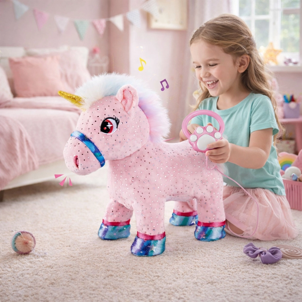 Unicornul interactiv este o alegere excelentă pentru copiii care iubesc îngrijirea animalelor. Jucăria se mișcă singură, merge și scoate sunete vesele, părând realistă și atrăgând natural în joc. Datorită lesei, unicornul poate fi condus cu ușurință, ceea ce încurajează mișcarea și distracția acasă sau în călătorii.