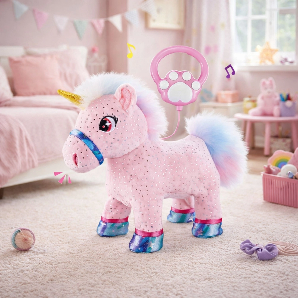 Adorabilul unicorn interactiv cu lesă va încânta orice copil care își dorește un animăluț magic propriu. Poate să meargă, scoate sunete, dă din coadă și, datorită funcției de înregistrare și redare, repetă vocea sau sunetele din jur. Realizarea moale din pluș este plăcută la atingere, lesa ușurează controlul și susține joaca activă și creativă.