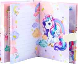 Jurnalul cu motiv unicorn este o alegere excelentă pentru copiii care vor să-și păstreze gândurile în siguranță. Datorită lacătului cu combinație și posibilitate de schimbare a codului, copilul are intimitatea pe deplin sub control. La deschidere se aude o melodie plină de bucurie care face scrisul și mai plăcut.
