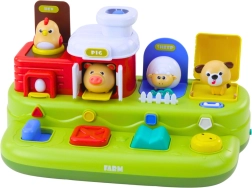 Ferma interactivă cu animăluțe este concepută pentru mânuțele mici ale copiilor. Diversele pârghii, butoane și rotițe în forme și culori diferite motivează copilul să exploreze și îl răsplătesc cu o reacție imediată – animăluțele sar din cutiuțele ascunse. Acest lucru consolidează curiozitatea naturală și susține dezvoltarea senzorială și concentrarea.