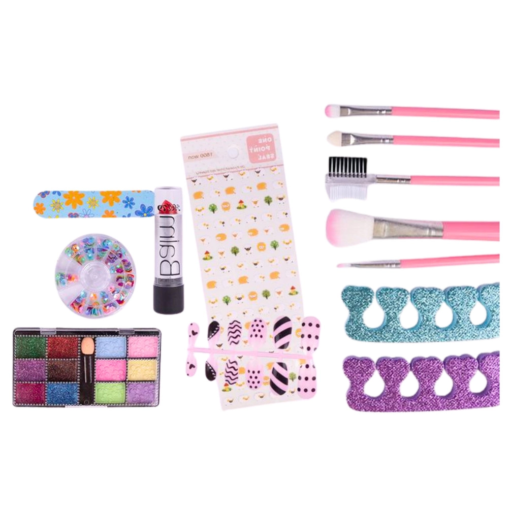 Paletă de farduri, ruj de joacă, pensule, aplicatoare, decorațiuni pentru unghii și separator pentru degete – un echipament variat pentru joacă sigură și creativă.