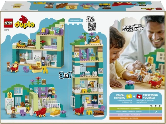 Descoperă setul versatil LEGO DUPLO casă de familie modernă 3 în 1 cu 166 piese pentru copii de la 2 ani. Copiii pot construi 3 modele diferite de casă – un apartament cu un etaj, o casă cu trei etaje sau o căsuță cu cinci etaje cu grădină pe acoperiș. Setul include 4 figurine de familie și numeroase accesorii (căruț, frigider, toaletă etc.) care susțin jocul creativ, dezvoltarea motricității fine și a abilităților sociale.
