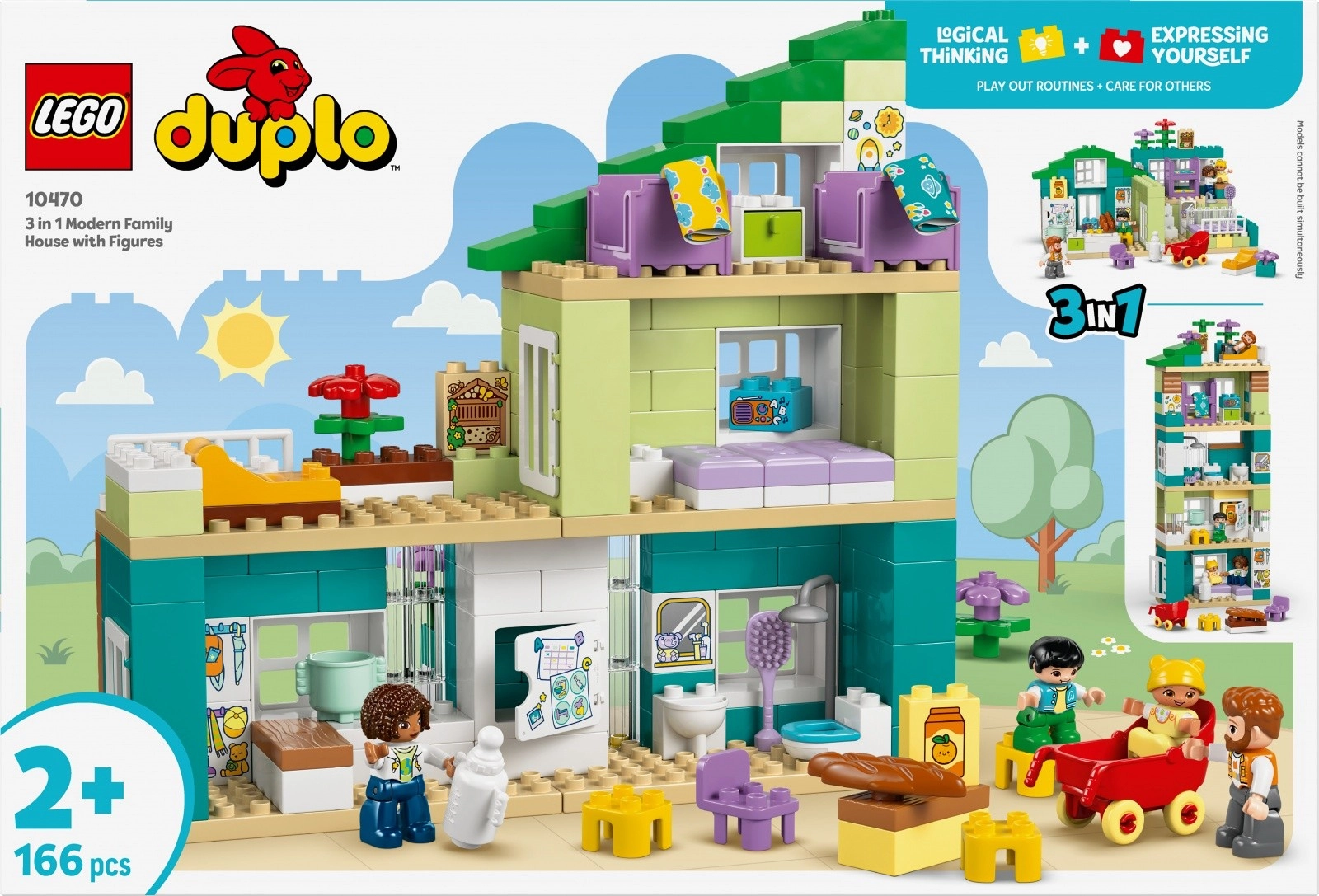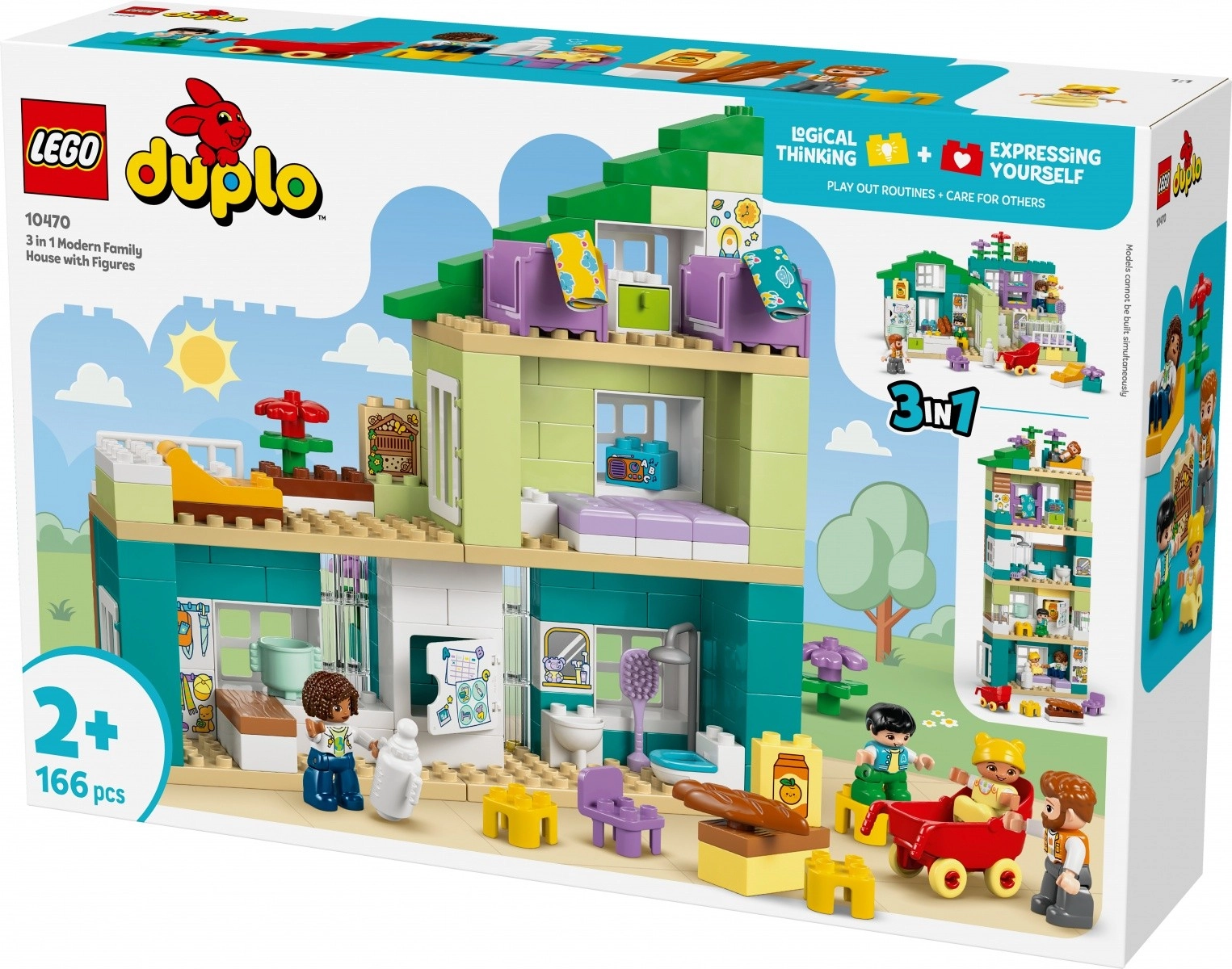 LEGO DUPLO Casă modernă de familie 3 în 1 oferă copiilor posibilități nesfârșite de creație. Datorită celor trei variante de construcție, micii constructori găsesc mereu noi aranjamente ale camerelor și detalii de descoperit. Piesele colorate, ușor de manevrat, și accesoriile gândite atent inspiră povestiri din viața reală.