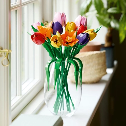Descoperă o modalitate creativă de a înfrumuseța interiorul: acest set din gama LEGO Botanicals îți permite să construiești un buchet impresionant de lalele, cu flori detaliate în nuanțe de roșu, galben, roz, portocaliu și mov. Tulpinile ajustabile și frunzele verzi îți permit să adaptezi buchetul la spațiu și la stilul vazei.