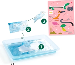 Setul creativ pentru marmorat de la DJECO oferă copiilor o modalitate distractivă de a crea motive unice cu animale. Este suficient să picuri cerneluri colorate pe suprafața apei, să creezi modele și să le transferi pe șabloane. Rezultatul sunt imagini originale care arată ca realizate de un pictor.