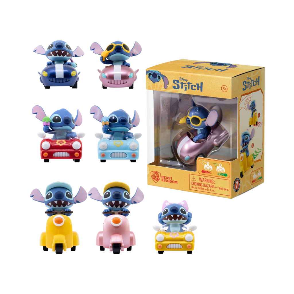 Colecția Stitch Zoom Hero îl aduce pe îndrăgitul erou STITCH în ipostaze jucăușe pe diverse mini vehicule. Fiecare piesă se remarcă printr-o paletă de culori expresivă și accesorii mici, precum ochelari de soare sau decorațiuni florale. Figurinele sunt ambalate într-o cutie transparentă din plastic, cu un design vizibil, care protejează produsul și în același timp evidențiază conținutul.