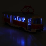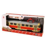 Tramvai roșu-alb anunță stațiile în limba cehă, astfel încât toți călătorii știu când trebuie să coboare. Tramvaiul anunță 7 stații: Gara principală, Aquapark, Grădina Zoologică, Stadion sportiv, Școală primară și grădiniță, Teatru, Centru comercial. Ușile se deschid manual, iar ca un detaliu reușit în plus, după deschidere interiorul se luminează în albastru. De fiecare dată când ușile se deschid, se aude un anunț, iar la închidere clipesc chiar farurile din față. Tramvaiul spațios este fabricat din plastic și se deplasează liber (freewheel). Așadar, poftiți la bord, începe o călătorie plină de distracție!