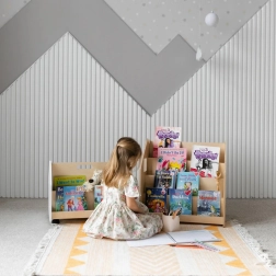 Designul elegant și curat al suportului de bibliotecă pentru copii BusyKids se potrivește perfect în orice interior. Rafturile frontale, joase și ușor accesibile le permit copiilor să aleagă cărțile după copertă, ceea ce le stimulează în mod natural interesul pentru citit și le dezvoltă autonomia. Partea din spate pentru depozitare oferă spațiu suplimentar pentru cărți mai mari sau jucării preferate.
