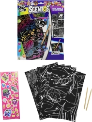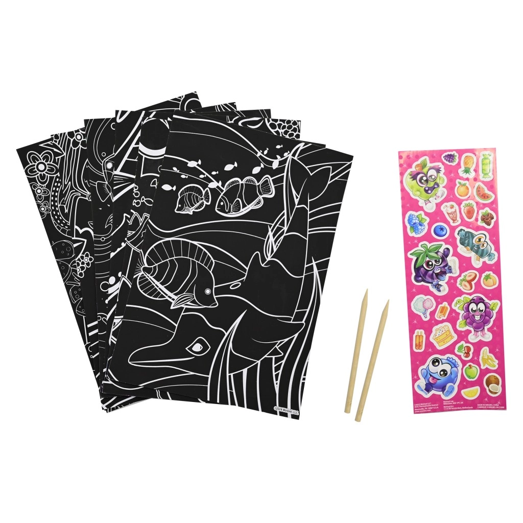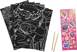 Cardurile negre dezvăluie culori vibrante după răzuire. Sunt incluse stylusuri din lemn și autocolante pentru decorare suplimentară.