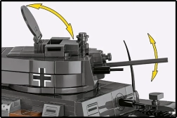Modelul este echipat cu funcții pentru o prezentare atrăgătoare și joacă: capace care se deschid, turelă și capac posterior al motorului detașabile, tun reglabil și șasiu realist cu șenile. Toate marcajele sunt inscripții durabile direct pe cărămizi. În cutie găsești și o figurină ofițer și o plăcuță albă de colecție cu numele și scara.