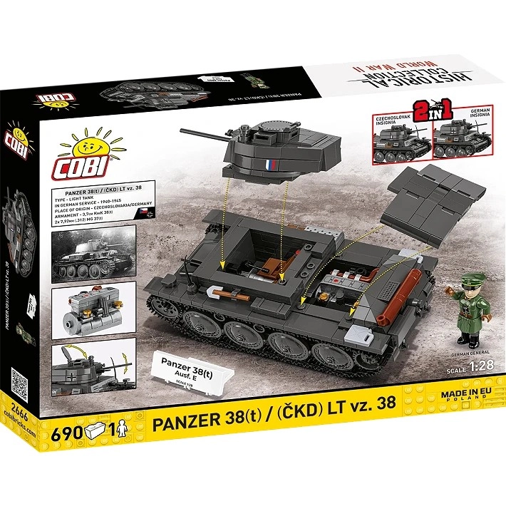 Construiește un tanc ușor iconic în două versiuni istorice cu setul de calitate de la COBI. Acest model 2 în 1 îți permite să alegi LT vz. 38 cehoslovac sau varianta germană Panzer 38(t). Te vei bucura de detalii la scara 1:28, șenile realiste, capace care se deschid, tun mobil și inscripții rezistente. Include și o minifigurină și o plăcuță de colecție.