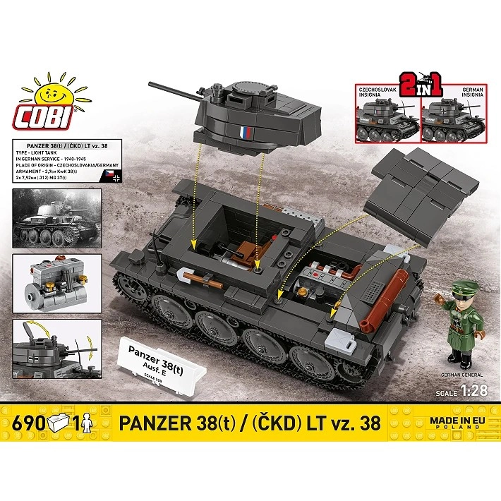 Un singur set, două versiuni istorice. Construiește LT vz. 38 cehoslovac sau Panzer 38(t) german și reconvertește-le oricând dorești.