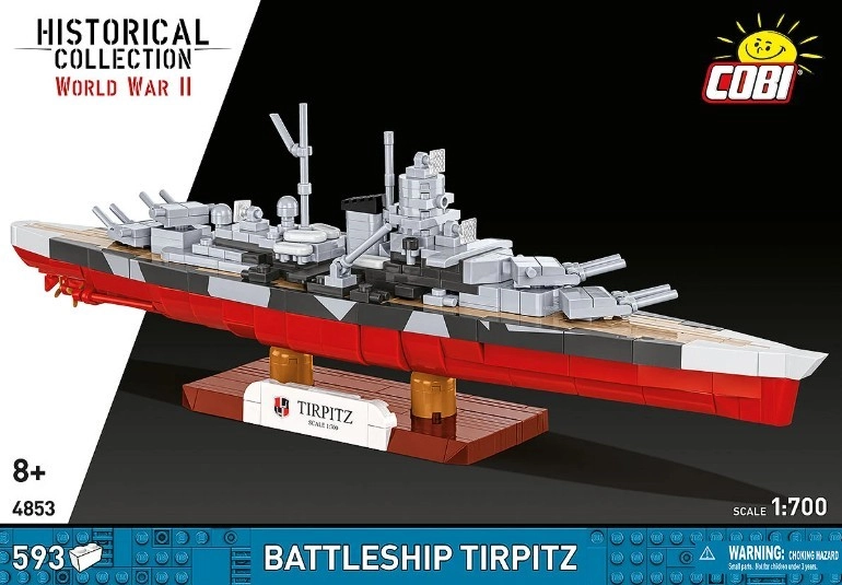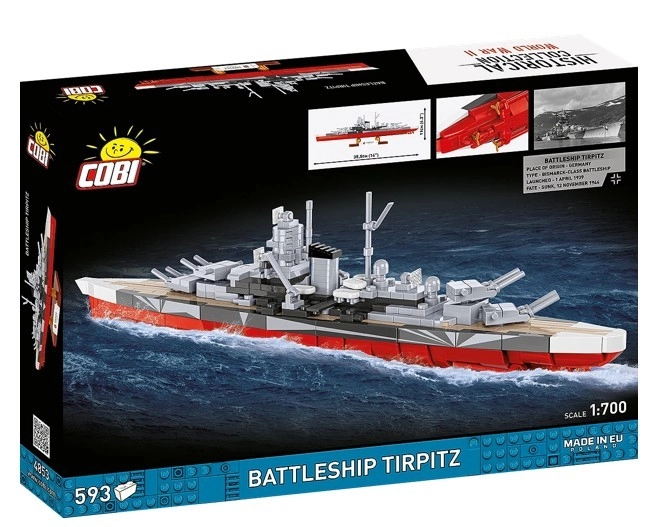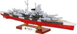 Bucură-te de o construcție precisă și de modelul final al faimosului cuirasat TIRPITZ, asamblat din cărămizi care se îmbină cu grijă. Datorită inscripțiilor autentice cu embleme și marcaje, fără utilizarea autocolantelor, obții o piesă de colecție durabilă, care arată excelent pe suportul inclus, cu numele navei și scara.