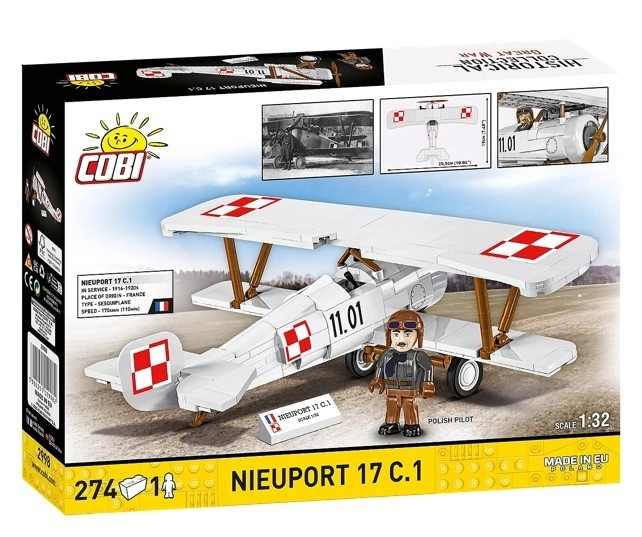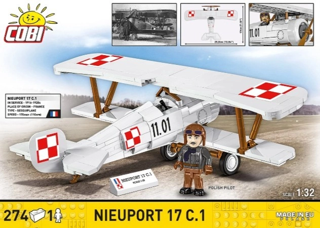 Nieuport 17 C.1 realizat fidel la scara 1:32, cu aripi de sesquiplan, elice rotativă și proporții realiste – ideal atât pentru joacă, cât și pentru expunere.