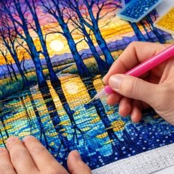Realizează-ți propriul tablou sclipitor folosind tehnica picturii cu diamante. Datorită pânzei pretipărite și legendei clare, vei aplica cu ușurință pietricelele pe locurile marcate și vei compune treptat o mozaică detaliată cu motivul mestecenilor lângă lac. Această activitate aduce liniște, concentrare și bucuria creației.
