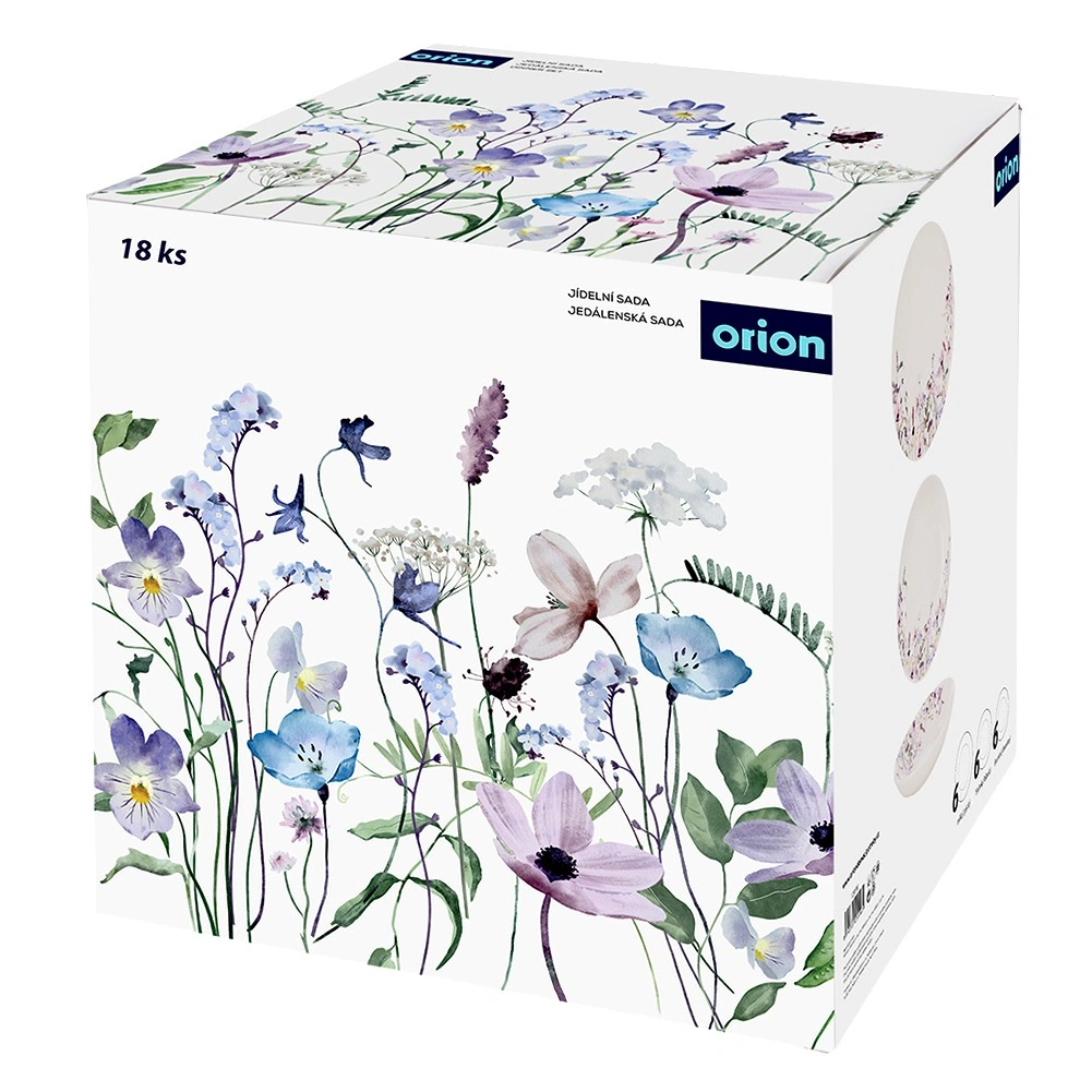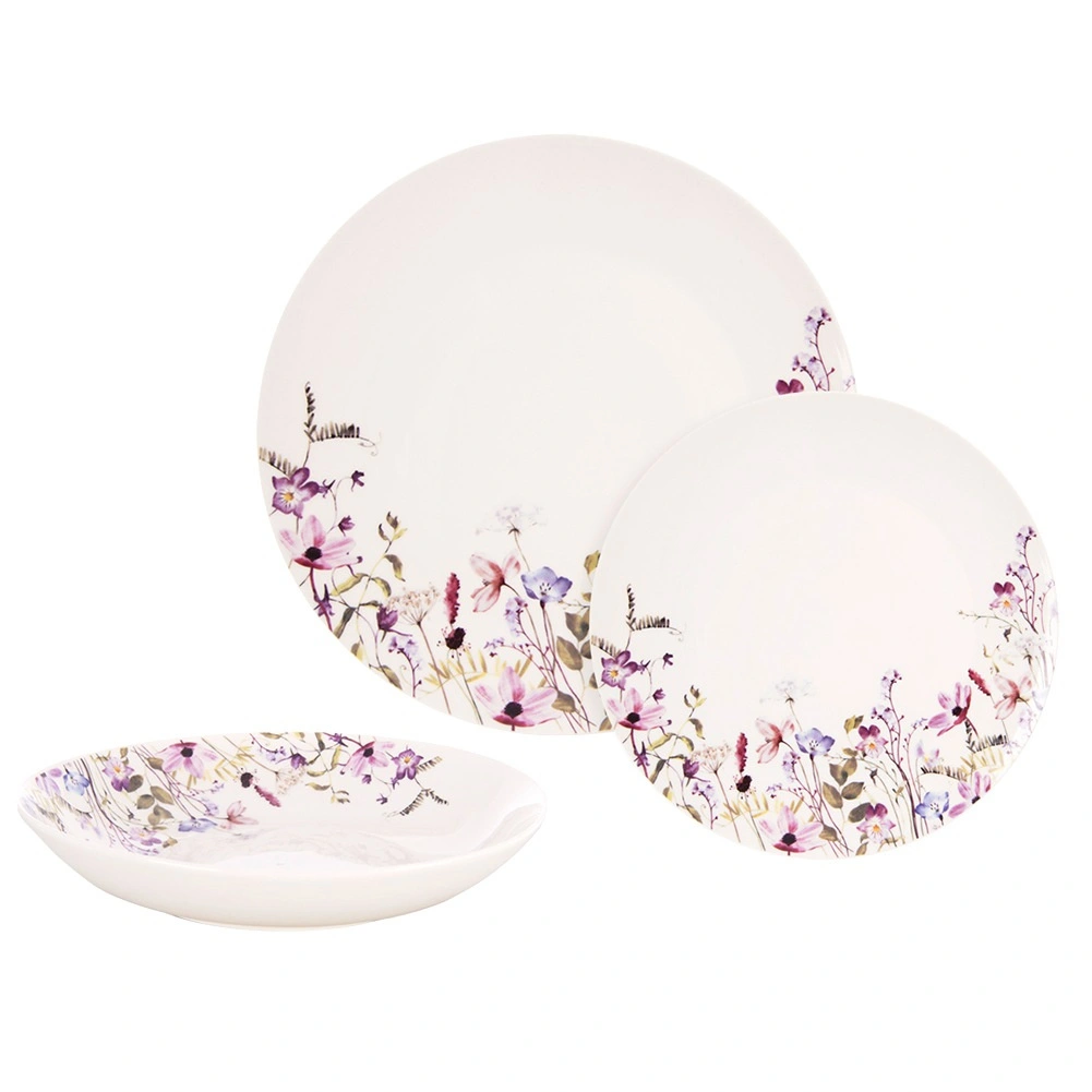 Setul conține 18 piese: 6 farfurii adânci, 6 farfurii mari întinse și 6 farfurii de desert – toate asortate într-un design elegant.