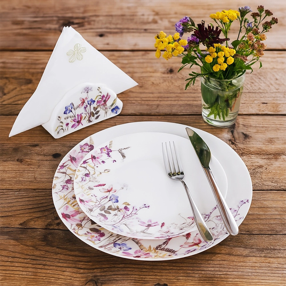 Porțelan alb cu imprimeu botanic în tonuri roz‑violet care adaugă rafinament și creează o atmosferă armonioasă.