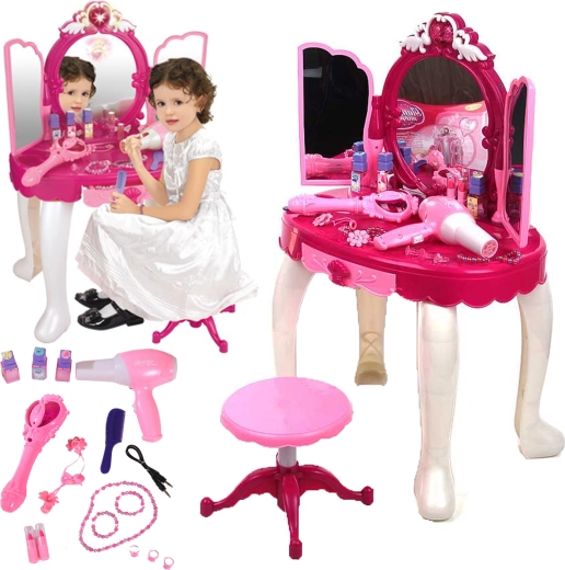 Măsuța de toaletă pentru copii, cu baghetă magică și intrare MP3, va încânta orice mică domnișoară. Oferă oglindă care se deschide la atingerea cu bagheta, efecte luminoase, sunete și uscător de păr funcțional pe baterii. Dimensiunile compacte și taburetul stabil asigură joacă confortabilă și sigură.