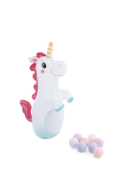 Unicornul gonflabil și 8 bile colorate susțin jocul activ, aruncarea prin inel și dezvoltarea coordonării.