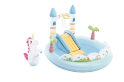 Siguranța și confortul sunt asigurate de zona de aterizare a toboganului cu căptușire suplimentară, rezervorul de joacă puțin adânc și construcția stabilă. Setul include un unicorn gonflabil ca element de box pentru joc activ și 8 bile colorate, care pot fi aruncate prin inelul de pe arcul castelului – copiii își dezvoltă astfel coordonarea și motricitatea fină.