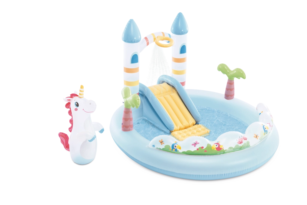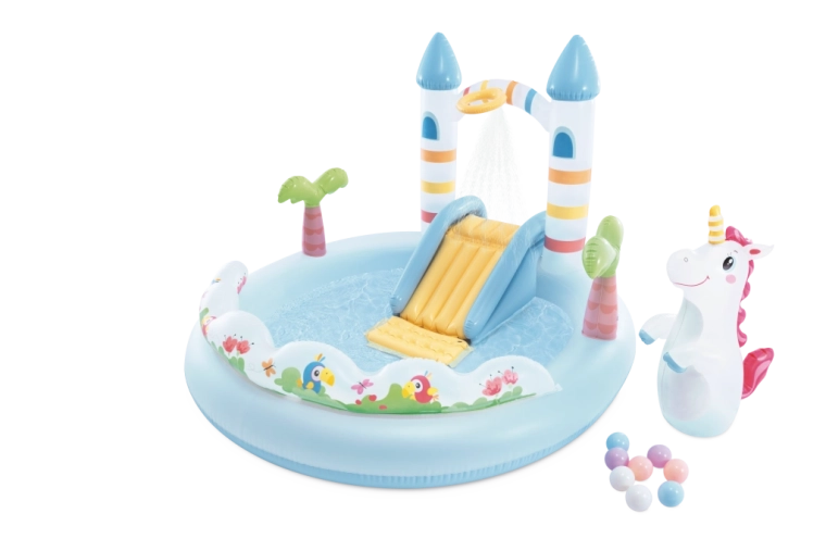 Transformă-ți grădina într-un loc de basm cu centrul de joacă Castelul Unicorn – set gonflabil acvatic pentru copii de la 2 ani. Oferă un bazin puțin adânc, un tobogan moale cu zonă de aterizare căptușită, duș de apă după conectarea furtunului și accesorii distractive, inclusiv un unicorn gonflabil și bile colorate pentru joacă și dezvoltarea motricității.