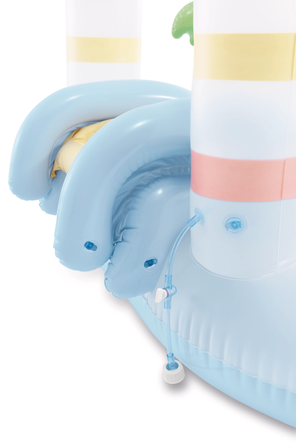 Arcul dintre turnuri, după conectarea furtunului de grădină, creează un duș plăcut care răcorește și face joaca acvatică mai agreabilă.