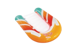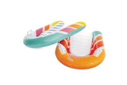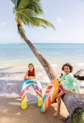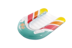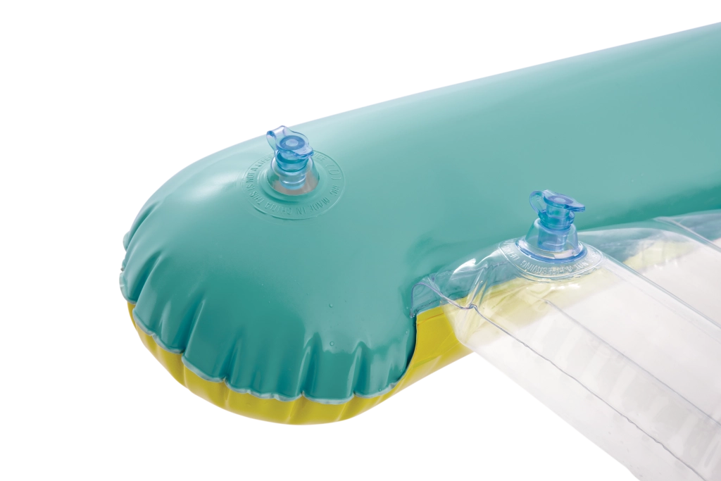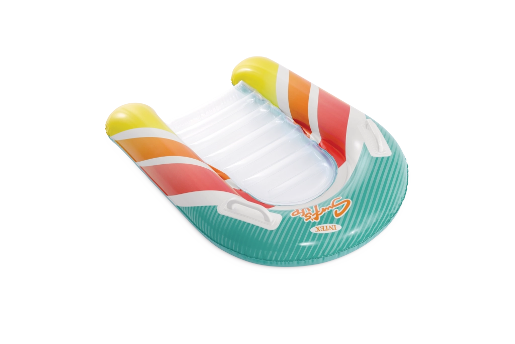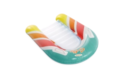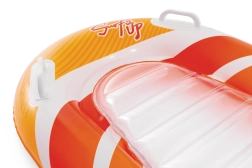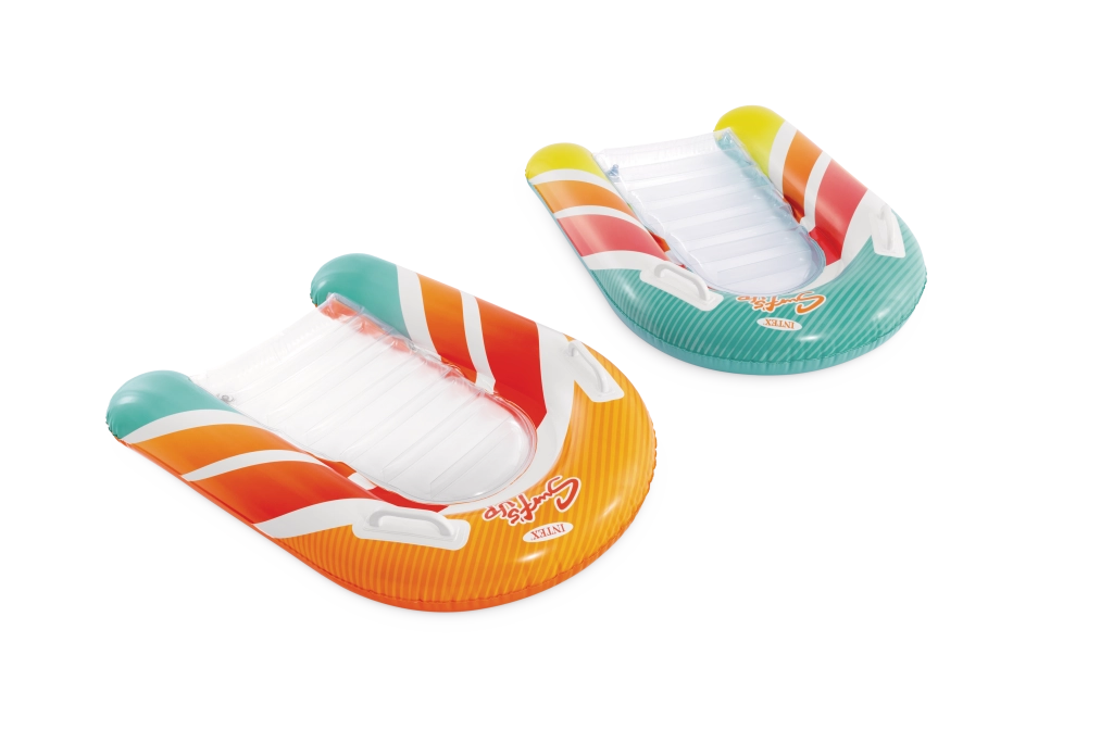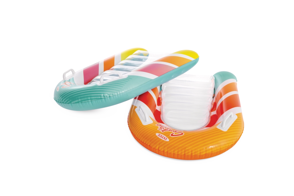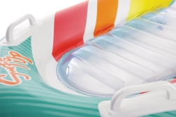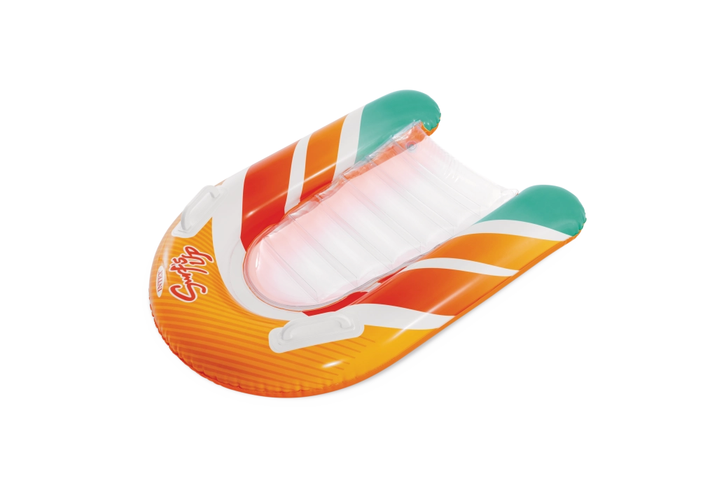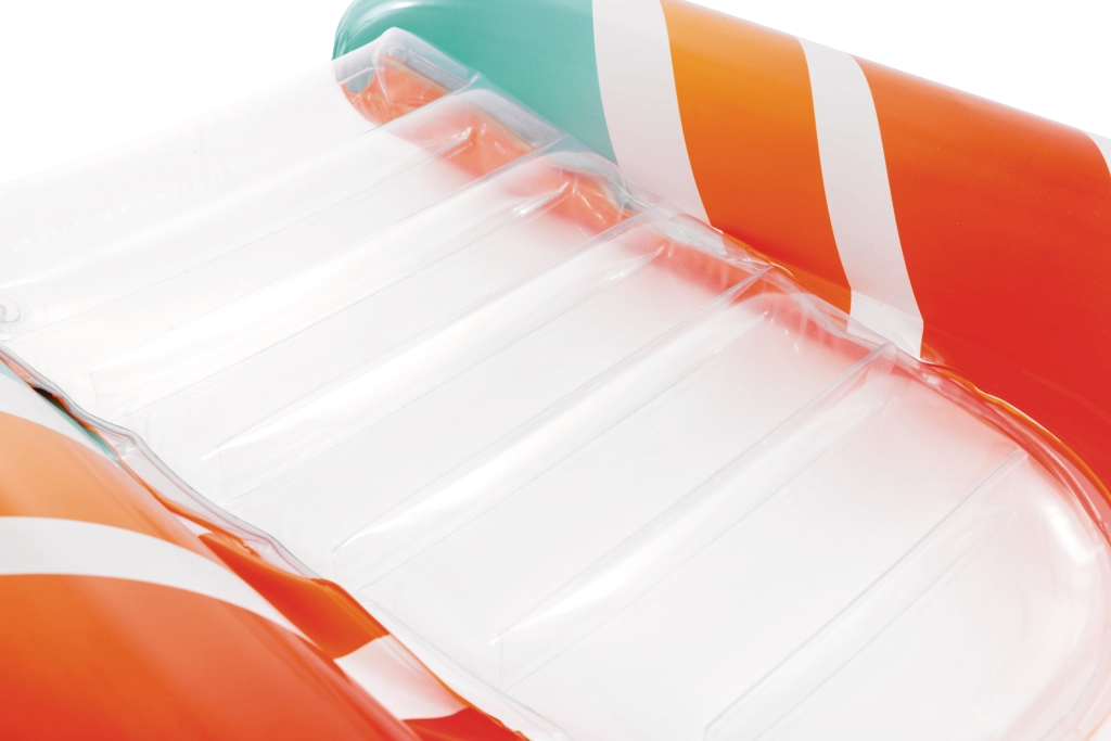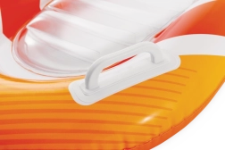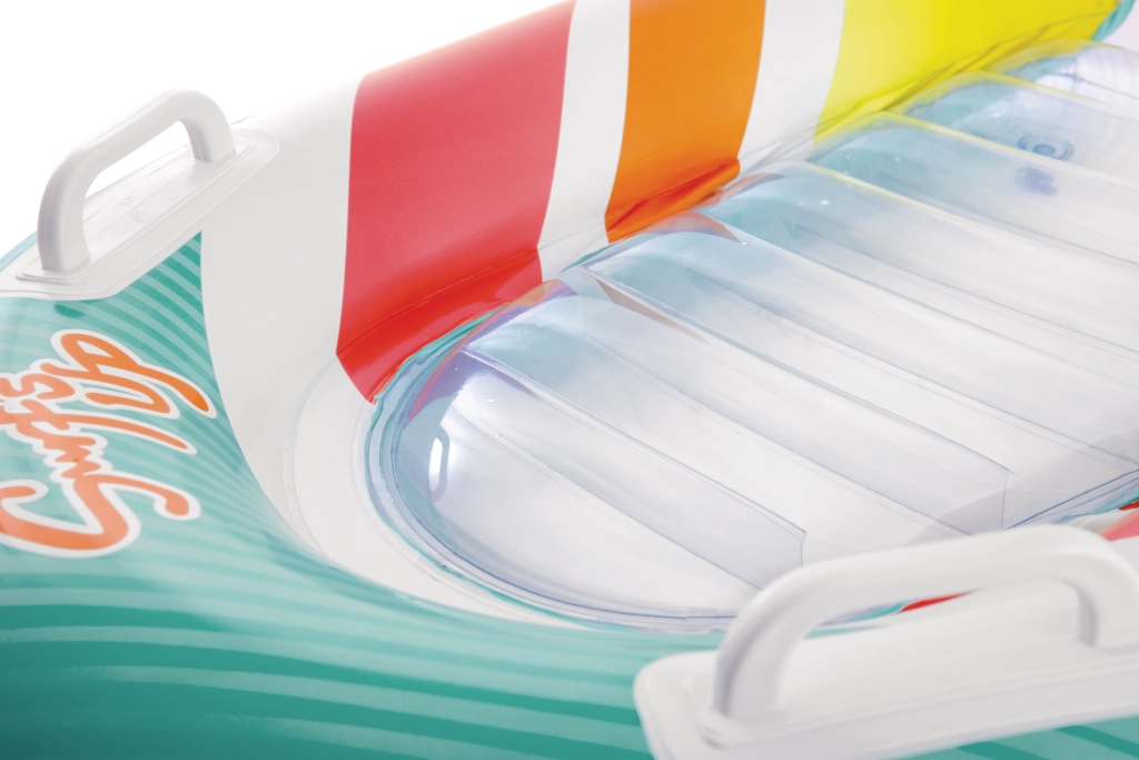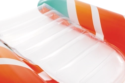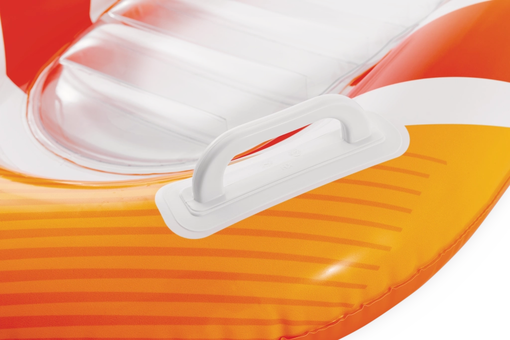 Zona transparentă, cu nervuri, a șezutului oferă confort și o mai bună distribuție a greutății pentru relaxare plăcută pe apă. Ventilele de siguranță previn pierderea aerului și facilitează umflarea și dezumflarea. Salteaua este disponibilă în două variante de culoare – cu dungi portocalii sau verzi – pentru ca fiecare copil să-și găsească stilul preferat.