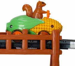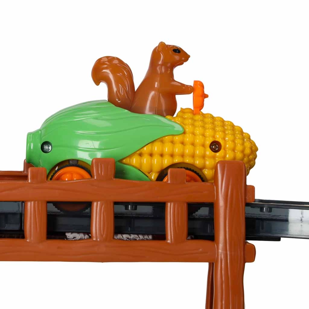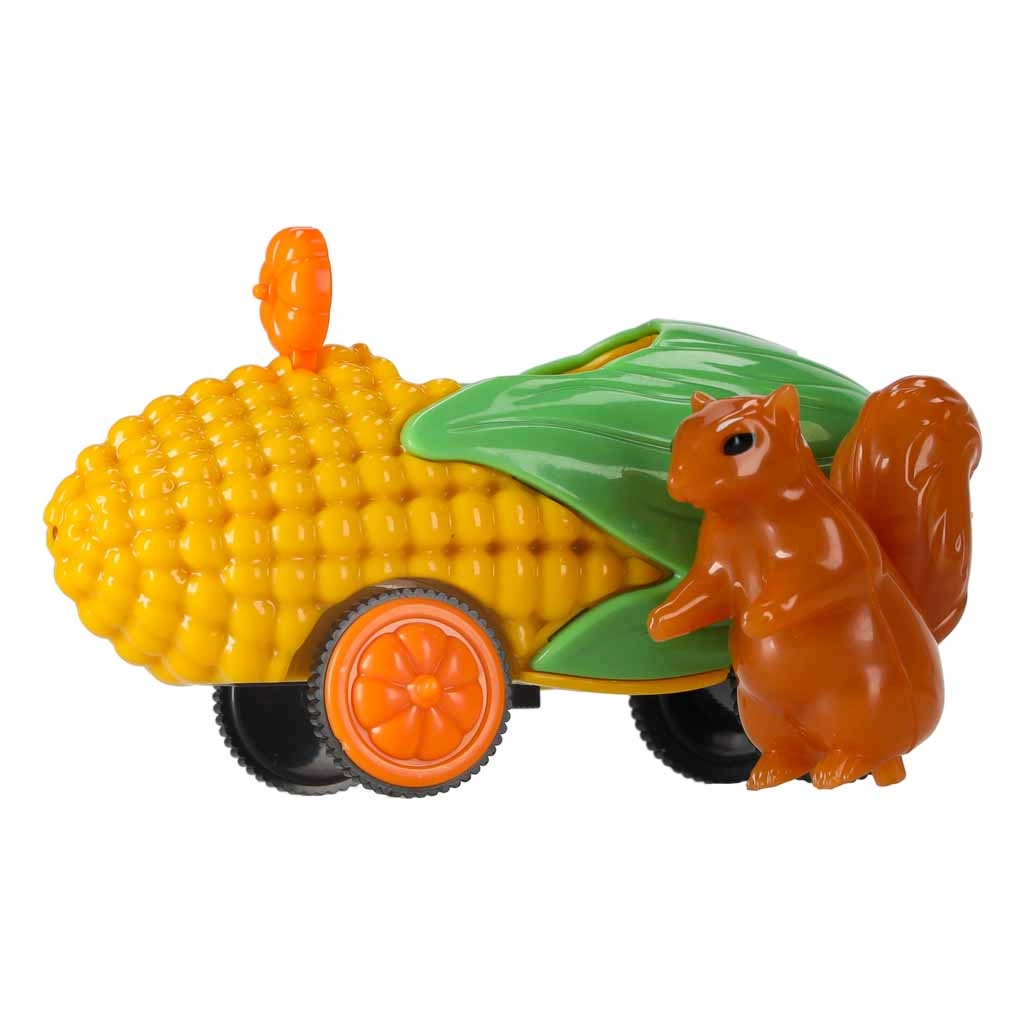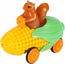 Drăgălașa mașină în formă de porumb, cu o veveriță la volan, aduce culoare și lumină în joacă. Motivația perfectă pentru micii piloți și pentru cursele de seară.