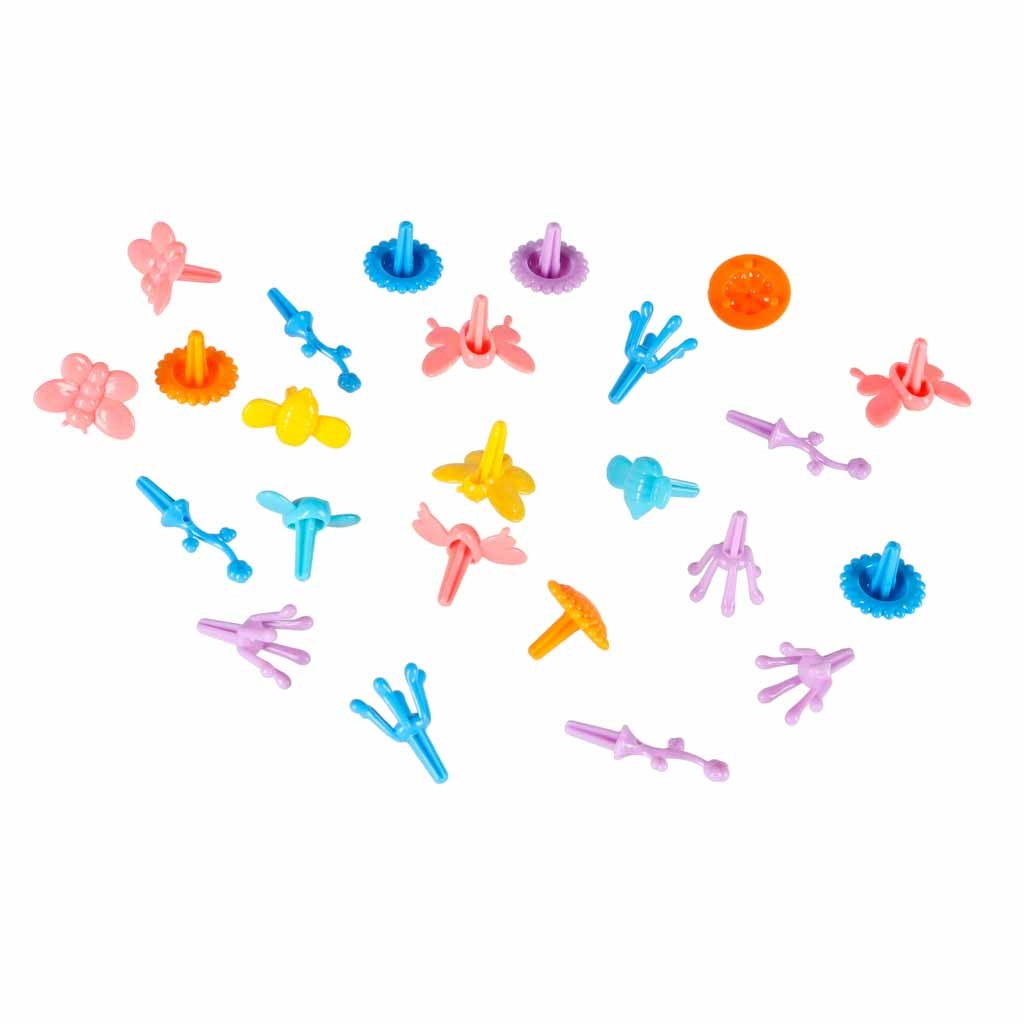 - 1× mașinuță luminoasă cu figurină, 13× segment de pistă, 15× conector inferior, pod rabatabil și barieră, stânci (2 buc), ramblee (5 buc), garduri (5 buc), stegulețe (2 buc), indicatoare (2 buc), flori cu tulpini (84 buc), copăcei (2 buc), fluturași (9 buc), animăluțe mici (9 buc), manual