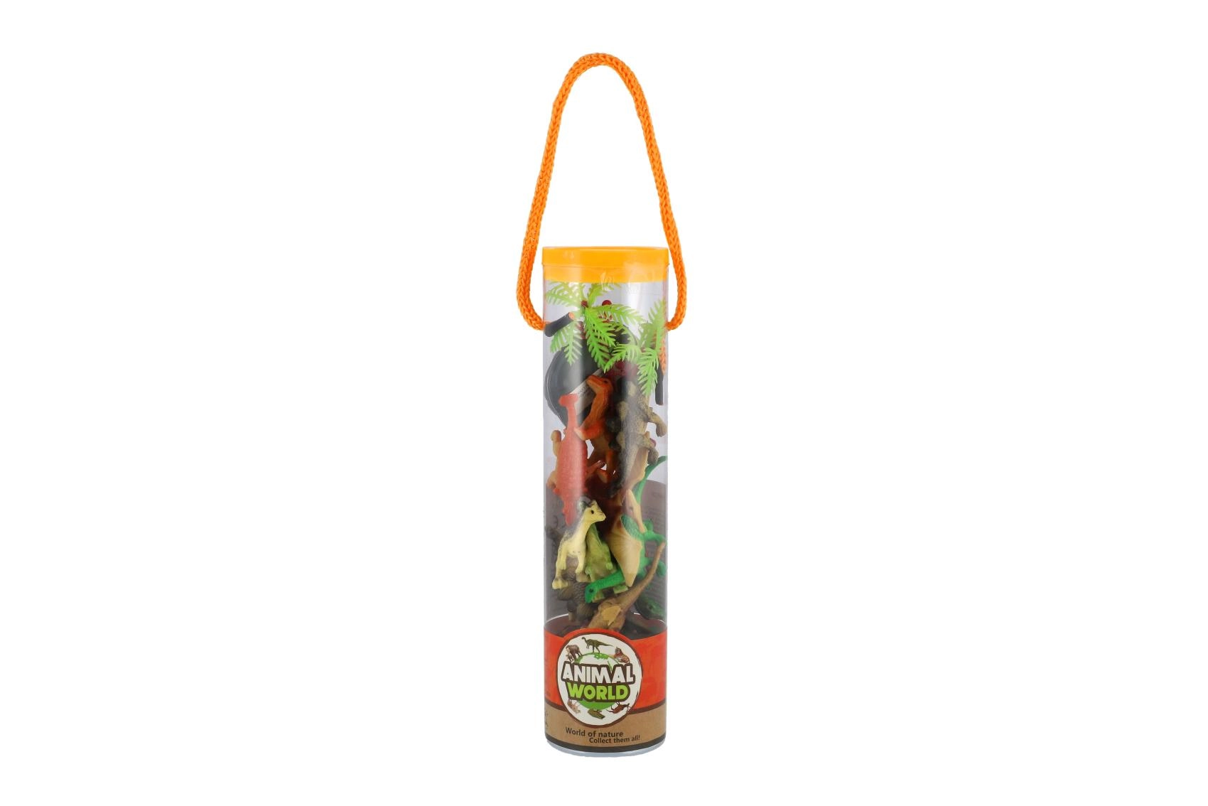 Setul de dinozauri din plastic într-un tub practic îi va încânta pe toți micii fani ai lumii preistorice. Pachetul conține mai multe figurine de diferite specii, cu dimensiuni de aproximativ 5–8 cm, ideale pentru joacă acasă, afară sau în călătorii. Plastic rezistent, detalii bine realizate și tub închis ermetic cu mâner pentru transport ușor fac din acest set un cadou grozav pentru jocuri creative.