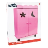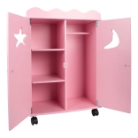 Acest dulăpior din lemn de calitate, într-o nuanță delicată de roz, este ideal pentru depozitarea ordonată a hainelor și accesoriilor păpușilor. Partea stângă oferă două rafturi practice, iar partea dreaptă este dotată cu o bară pentru umerașe pentru rochițe. Ușițele cu închidere magnetică se manevrează ușor, iar decupajele în formă de stea și lună conferă mobilierului un aspect atrăgător.
