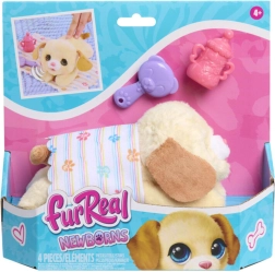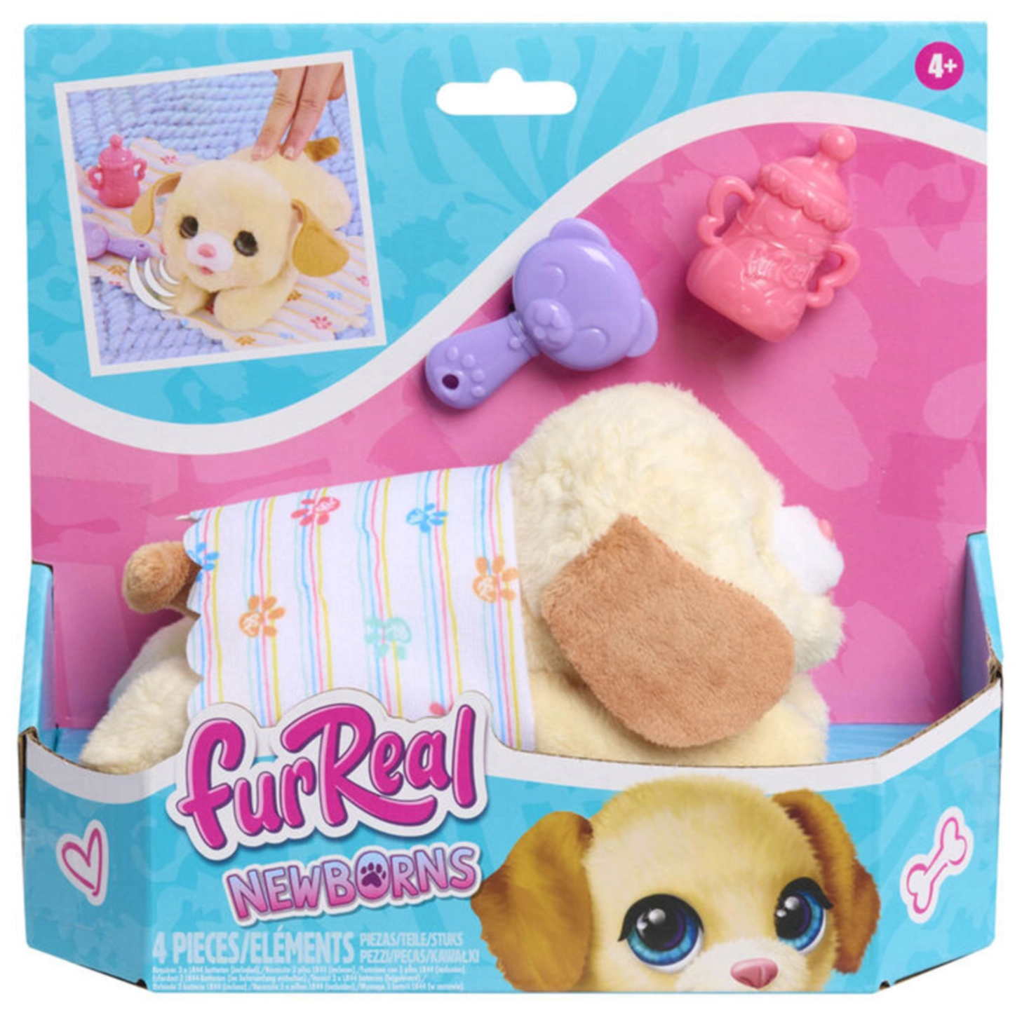 Adorabilul cățeluș interactiv FurReal Newborns va fi iubit de toți copiii care adoră animalele. Are un trup moale din pluș, ochi mari albaștri și un năsuc roz. Reacționează la mângâierea pe spate cu sunete vesele, iar după hrănirea cu biberonul sau pieptănat închide ochii și scoate sunete de bucurie. Pachetul include suziță, biberon, perie și păturică pentru și mai multă grijă și alint.