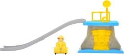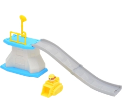 O rampă gri curbată cu platformă albastră și balustradă galbenă asigură o coborâre lină a vehiculului și multă distracție dinamică.