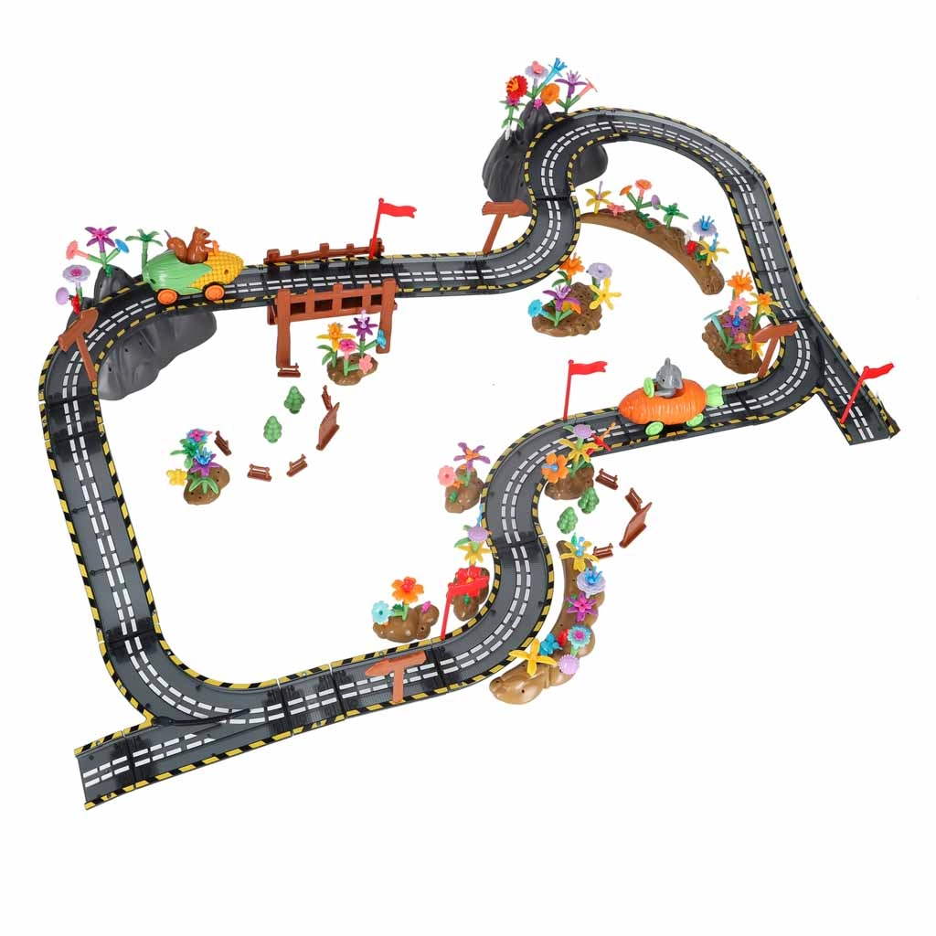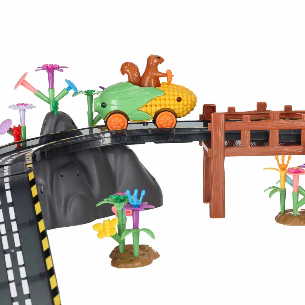 Sunt incluse 2 vehicule cu personaje drăgălașe (veveriță și koala), pod, barieră, obstacole stâncoase și conectori de rigidizare pentru o pistă mai solidă. Excelent pentru dezvoltarea abilităților STEM – planificare, gândire logică și aptitudini de construcție.