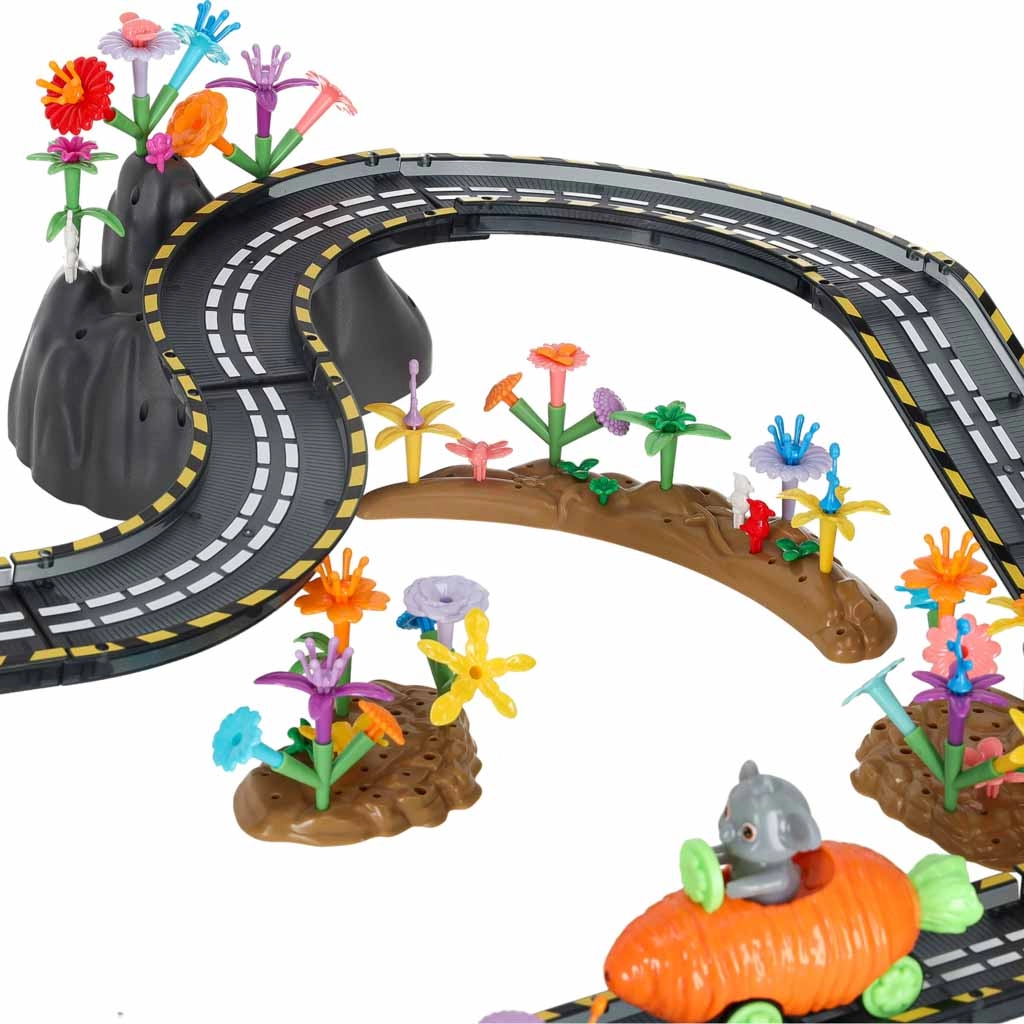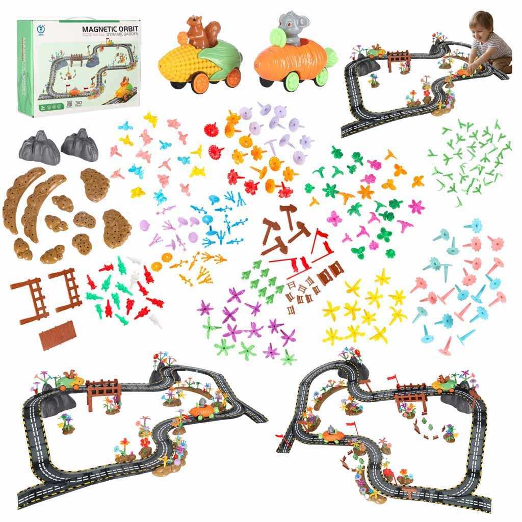 Descoperă lumea creativă a construirii cu această pistă de curse magnetică din 310 piese. Copiii pot construi și reconstrui cu ușurință propria pistă, completată cu poduri, stânci, garduri și flori. Două mașinuțe luminoase adorabile (morcov și porumb) cu figurine de animale aduc joacă mai dinamică, în timp ce conexiunea magnetică asigură stabilitate și construcție fluentă. O jucărie STEM ideală pentru a susține logica, creativitatea și imaginația.