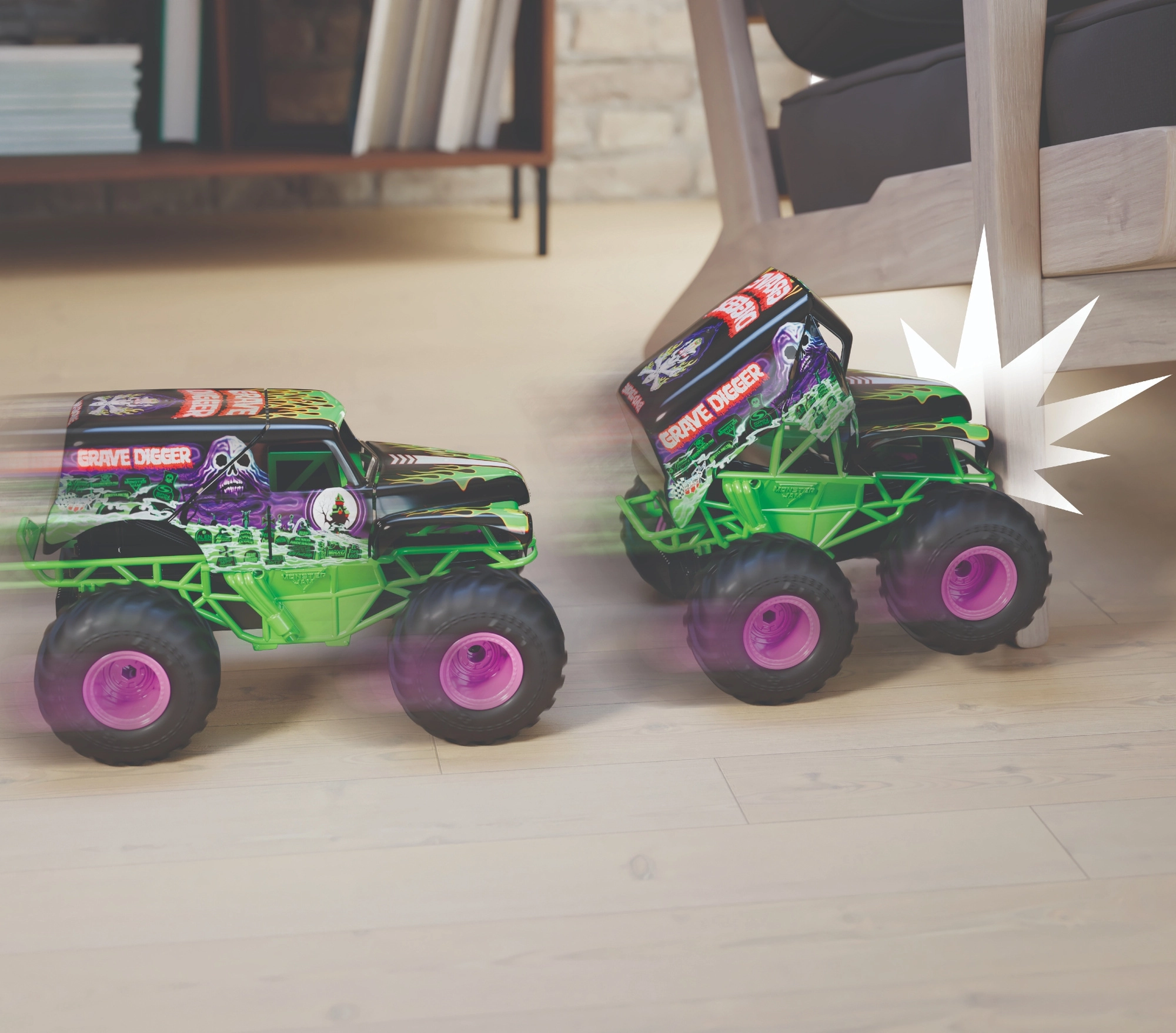 Legenda MONSTER JAM pentru colecția ta: GRAVE DIGGER cu grafica negru‑verde distinctivă, anvelope uriașe și șasiu înălțat. Scara 1:15 oferă un raport excelent între dimensiune și manevrabilitate, iar banda de rulare din cauciuc asigură tracțiune pe asfalt, covor și suprafețe mai dure.