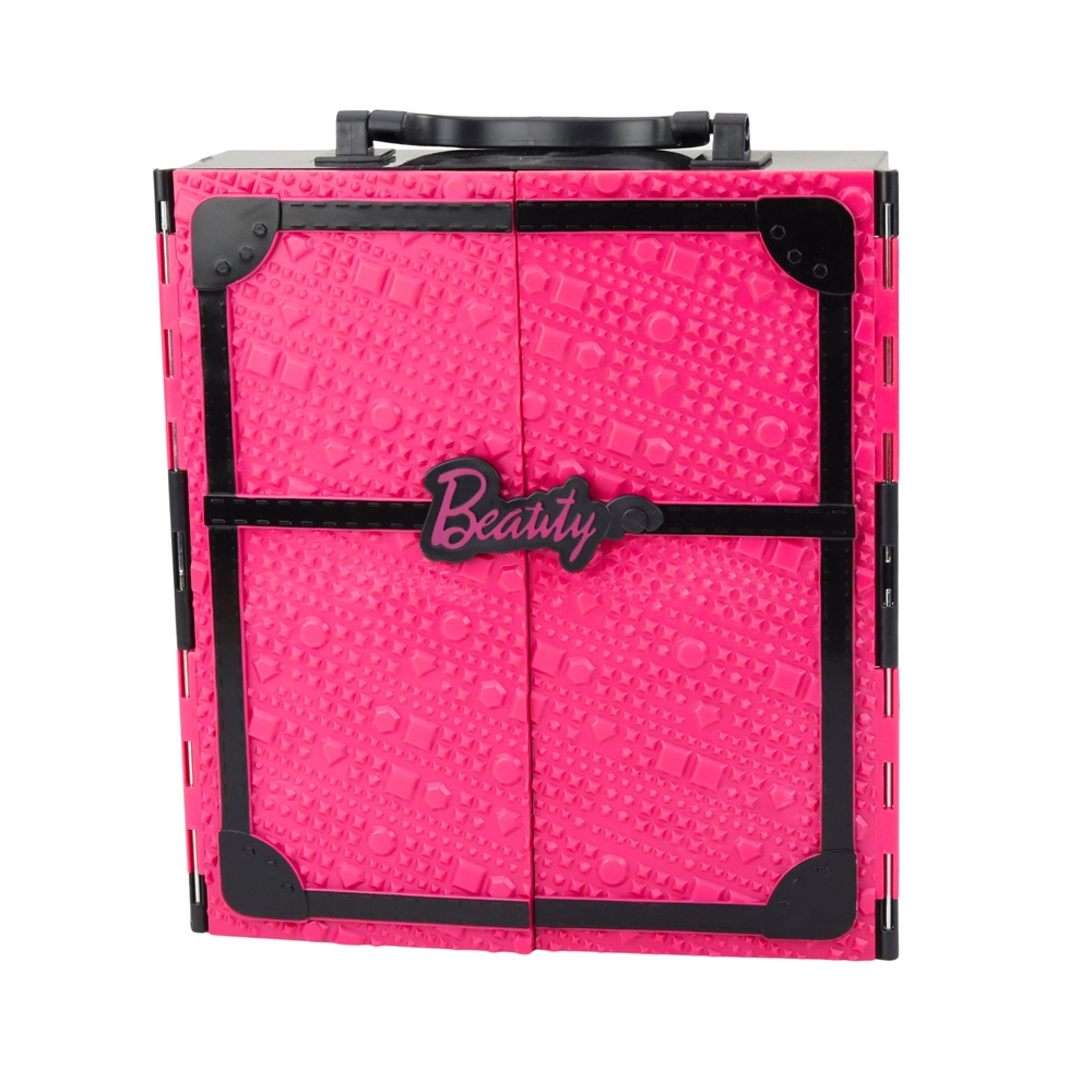 Garderoba pliabilă roz îmbină o căsuță și un dressing portabil pentru păpuși. La deschidere apare un spațiu ordonat cu polițe, sertare și umerașe, care inspiră la crearea de ținute și menținerea ordinii. Include o păpușă mare (cca 30 cm) și un set de rochii elegante, pantofi, genți și bijuterii.