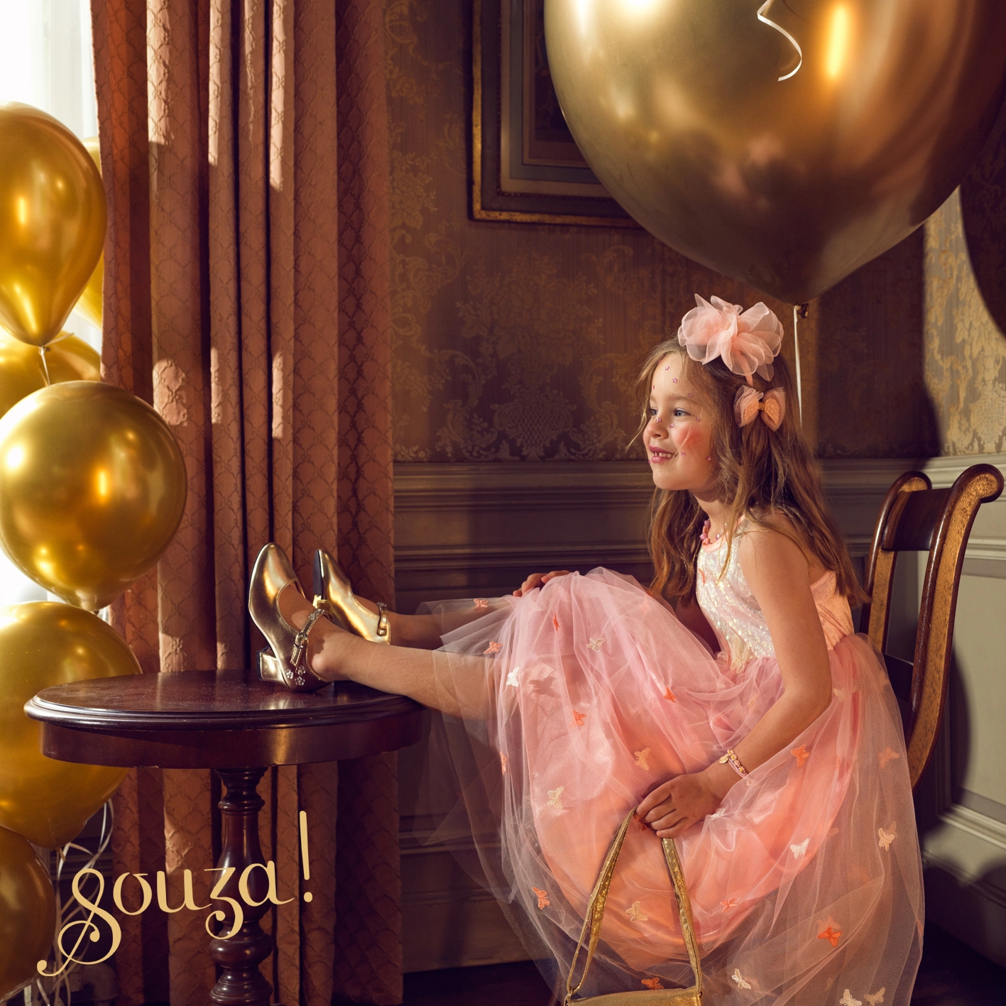 Corsajul roz deschis se potrivește perfect cu fusta amplă din tul decorată cu fluturi fini, care oferă rochiei delicatețe și o notă magică. Ideal pentru petreceri de aniversare, petreceri costumate, ședințe foto și joaca zilnică de-a prințesele.