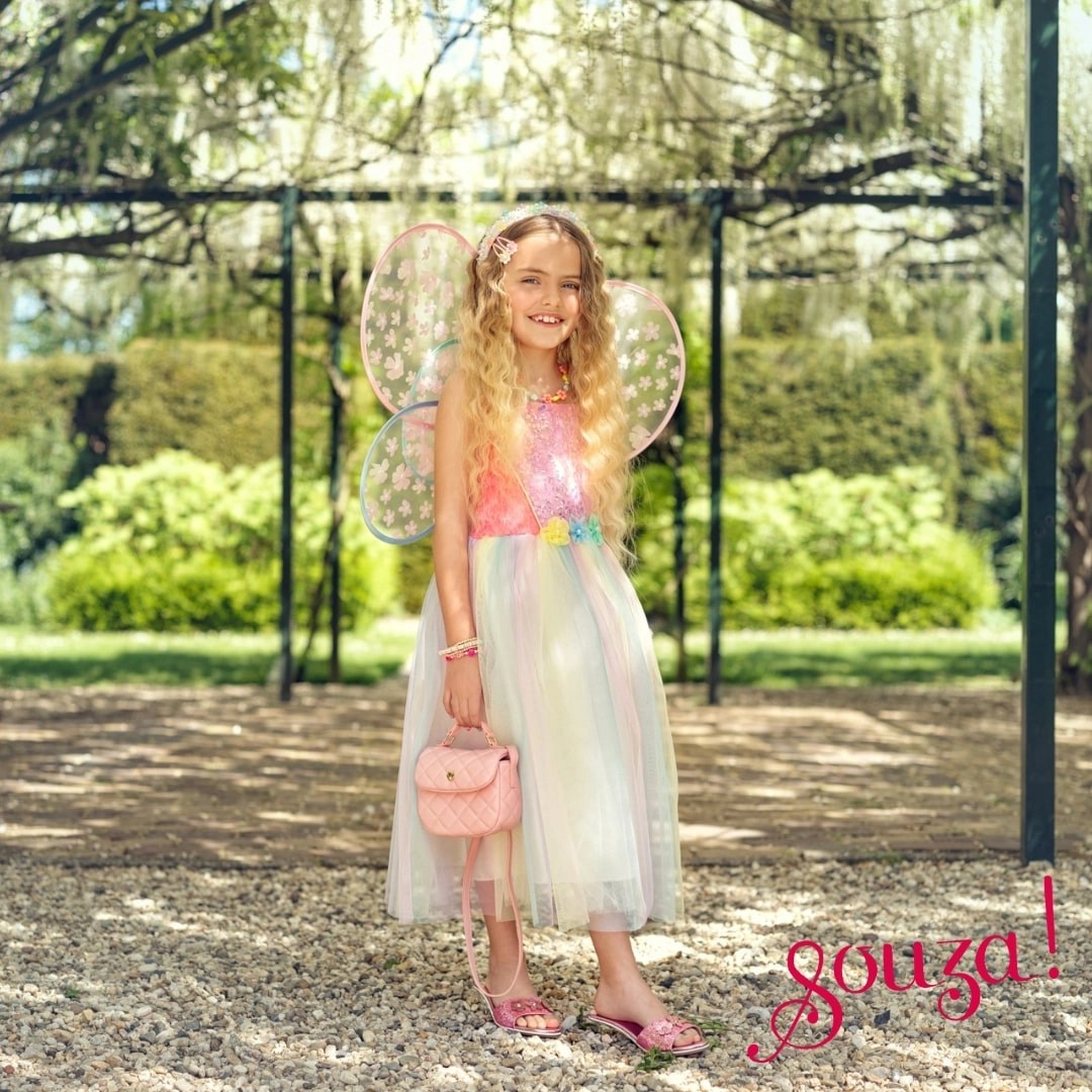 Încântați micuța prințesă cu costumul fermecat de zână Flora, cu aripi fine și tul curcubeu. Rochia are croială clasică, corsaj confortabil cu bretele duble și este decorată cu flori în talie. Tul curcubeu ușor, aripi transparente, multistrat în nuanțe de roz și confort la purtare fac din acest costum alegerea ideală pentru carnaval, petreceri și joaca de zi cu zi.