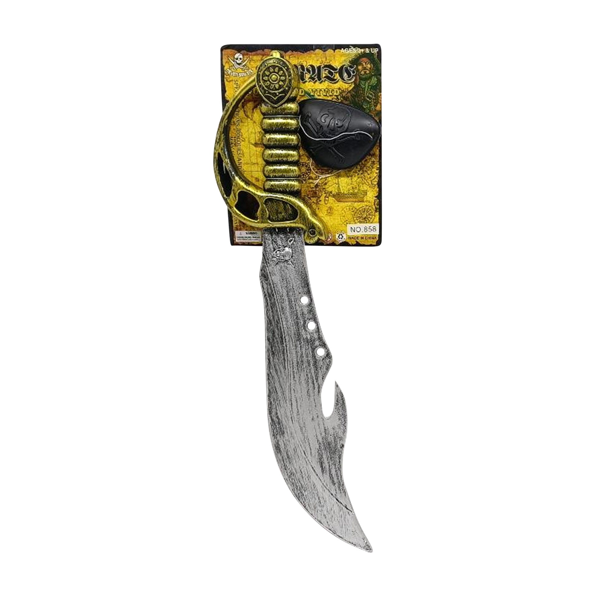 Sabie curbată cu lamă patinată și craniu pe mâner, oferind costumului detalii realiste care impresionează din prima clipă.