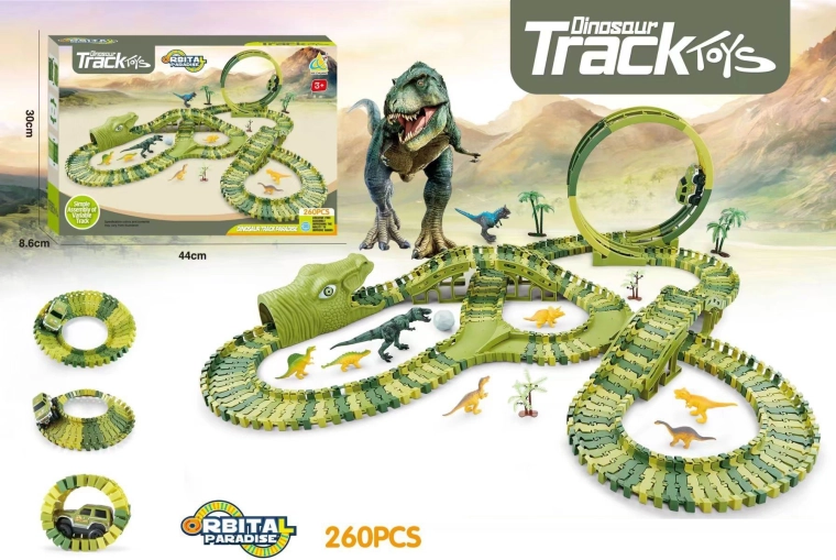 Această pistă colorată cu dinozauri oferă copiilor ore de distracție și dezvoltare a imaginației. Datorită celor 260 de piese, traseul poate fi asamblat în diverse forme și înălțimi, astfel încât fiecare joacă este diferită. Este inclusă o mașinuță cu baterie, care parcurge pista și îi stimulează pe copii la joacă creativă.