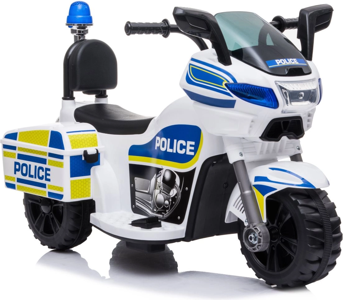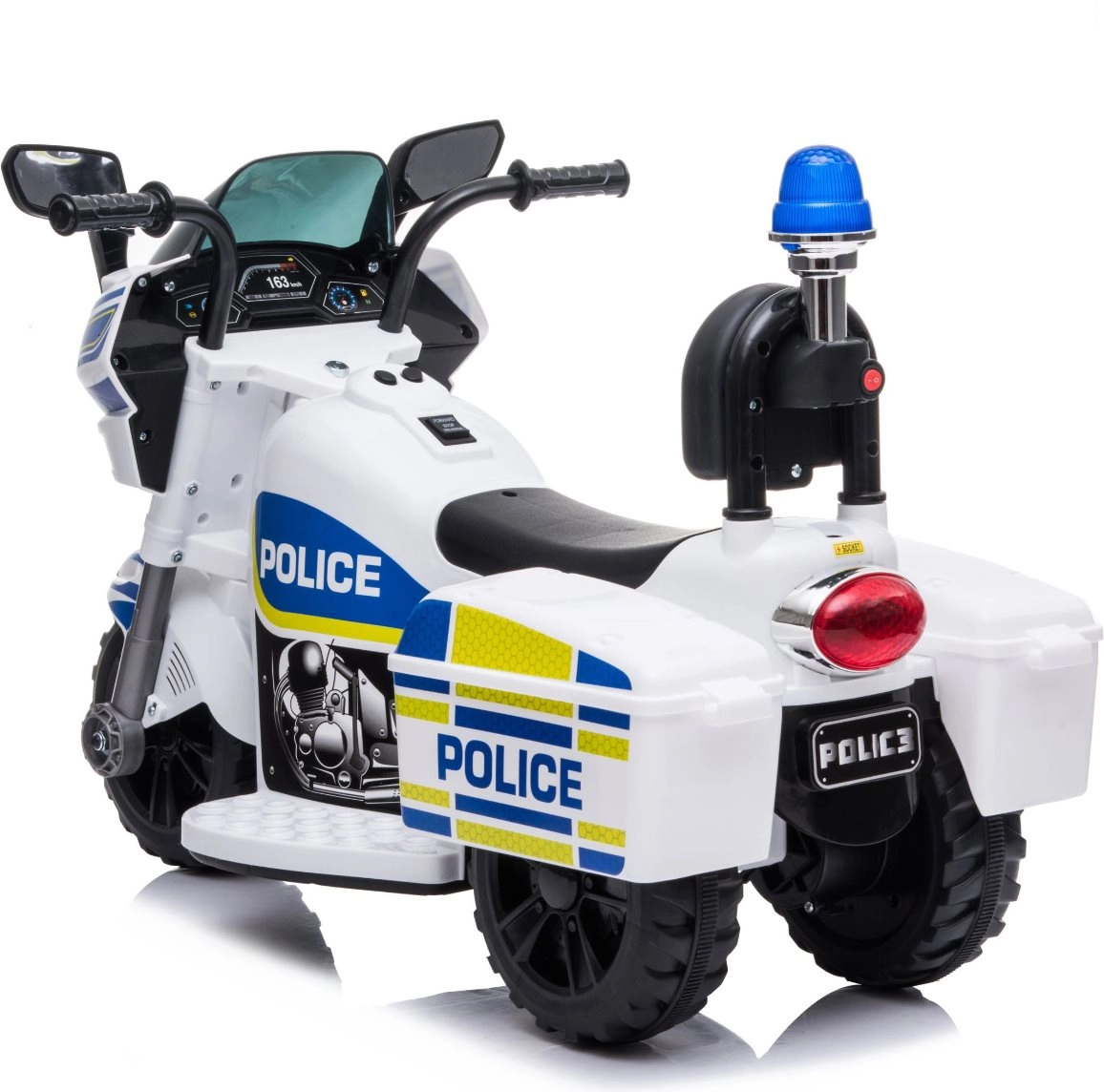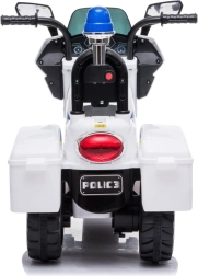 Motocicletă electrică de poliție pentru copii, stilată, în combinație alb‑albastru, oferă acțiune de poliție realistă cu lumini intermitente, sunet de sirenă și control ușor înainte/înapoi. Construcția trike stabilă, scaunul ergonomic cu spătar și viteza de până la 3 km/h asigură distracție în siguranță acasă și afară. Intrarea MP3 integrată, claxonul și butoanele muzicale susțin jocul de rol și dezvoltarea coordonării.