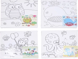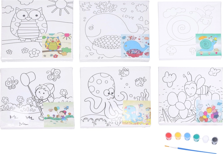 Setul oferă o selecție de teme îndrăgite: bufniță, balenă, melc, băiat cu minciog, caracatiță și albină. Fiecare pânză are contururi clare și o mică previzualizare color pentru finalizare ușoară.