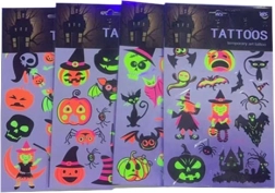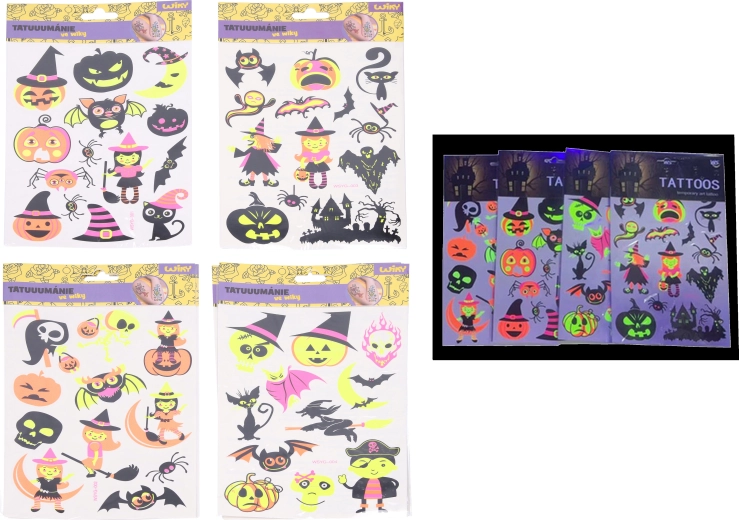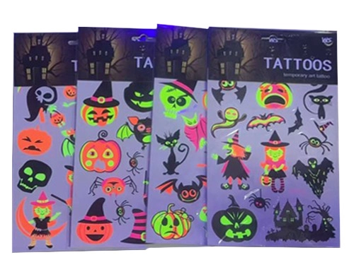 Înviorați-vă ținuta de Halloween cu tatuaje temporare care strălucesc la propriu sub lumină UV. Aceste autocolante fluorescente sunt o alegere excelentă pentru copii și adulți – aplicare rapidă, culori intense și purtare confortabilă fără iritarea pielii.